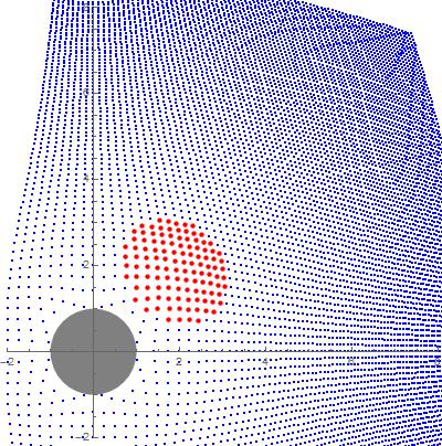 In the bottom panel I’ve transformed* the picture to represent space in the neighborhood of a black hole (the gray circle is its Event Horizon) as seen from a distance. Close-up, every row of dots would appear straight. However, from afar the disk’s apparent size and shape depend on where it is relative to the BH.