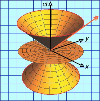 If we ignite a flash of light at time t=0, at any positive time t that lightwave will have expanded to a circle (or bubble) with radius d=c·t. The circles form the “future” cone.