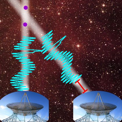 “They don’t get the picture at the same time. With an atomic clock you can take account of when each signal arrives at each dish. Here’s a diagram I did up on Old Reliable. It’s way out of scale but it makes the point, I think. We’ve got two dishes at the bottom here, and those purple dots are two galaxies. Each dish sees them on top of each other and can’t distinguish which one sent that peaky signal. What’s important is, the dish on the right receives the signal later. See that red bar? That’s the additional path length the signal has to travel to reach the second dish.”