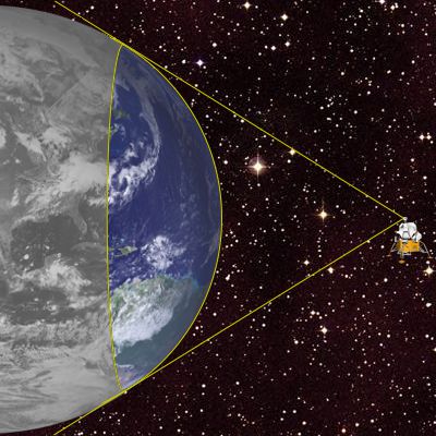 “Take a closer look someday. It shows Antarctica but essentially nothing north of the 45th parallel. The limit’s set by the points on the planet where lines from your eye just graze the planet’s surface. The astronauts in this LEM, for instance, are about an Earth-radius away. They’d be able to see the Atlantic Ocean and a little bit of Brazil, but neither of the poles and no part of the USA.”