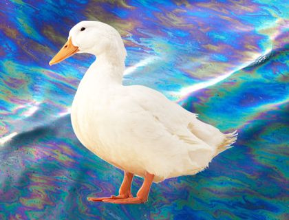 “Not unless you throw detergent on him, like they have to do with waterfowl after an oil spill. Detergent molecules have a polar end and a non-polar end so they can bridge the electro divide. Rubbing detergent into a dirty bird’s sludgy oil coating lets water sink into the mess and break it up so you can rinse it off. The problem is that the detergent also washes off the good duck oil. If you let a washed-off duck go swimming too soon after his bath the poor thing will sink. You have to give him time to dry off and replenish his natural feather-oil.”