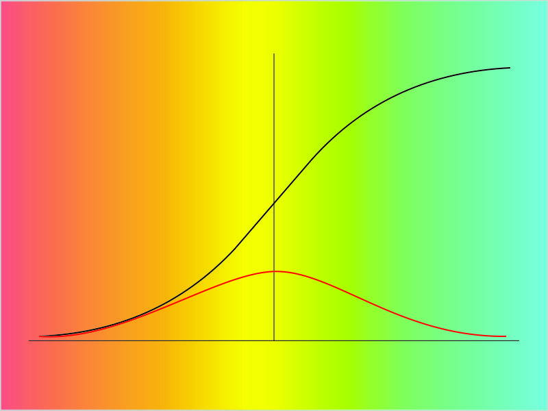 “That’s the interesting part I’m trying to write about. One way to look at it is that it’s simply the slope of the Logistic curve. See how where the Logistic is rising, the slope is rising, too? That’s the way exponentials work — ‘the higher the faster‘ as they say. The slope switches direction just where the Logistic switches from growth to slow-down. The Logistic Curve approaches its limit when the organism’s population approaches the carrying capacity of the territory. That’s also where the slope gets shallowest. Very few resources, very little expansion.”