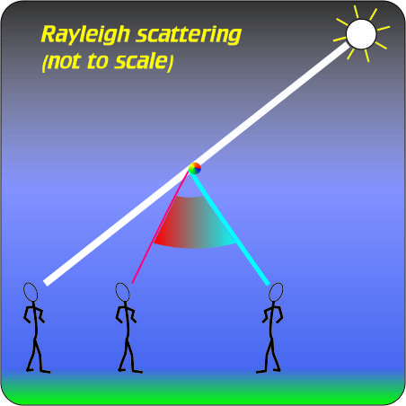 “Yeah, but life’s more interesting for smaller somethings. For things like air molecules and dust particles that are much smaller than the the wavelength of visible light, the waves generally swerve around the particle. How much they swerve depends on the wavelength — extreme blue light bends about ten times more than extreme red light for the same scattering particle. So suppose there’s a kid a few miles away from us looking at the sky while we’re looking at it here. There’s a sunbeam with a rainbow‑load of photons headed for the kid, but there are dust particles in the way. Get the picture?”