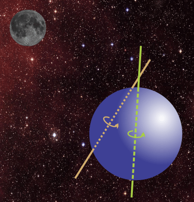 “There’s no direct evidence, so far as I know, but it seems reasonable on physical grounds. We’ve got two gyrations going on here, right? The Moon is on a 29½‑day orbit while the Earth rotates about thirty times faster. But the two motions use different frames. The Earth’s spin axis runs through the geometric center of the planet and tilts 23° from its orbit axis. Meanwhile the whole Earth‑Moon system rotates about its barycenter, their common center of gravity, which stays inside the Earth about ¾ of the way moonward from the Earth’s middle. That rotation is about 5° away from Earth’s orbit’s axis. Imagine a molten blob near the barycenter, happily following the Moon in the Earth-Moon frame, but the rest of the planet is saying, ‘No, no, you’re supposed to be moving hundreds of miles an hour in a different direction!‘ If the blob’s the least bit lighter or heavier than its neighbor blobs, inertial forces expend energy to kick it out of there.”