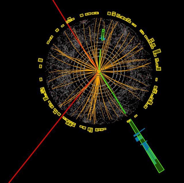 Electrons (green) and muons (red) exiting the event