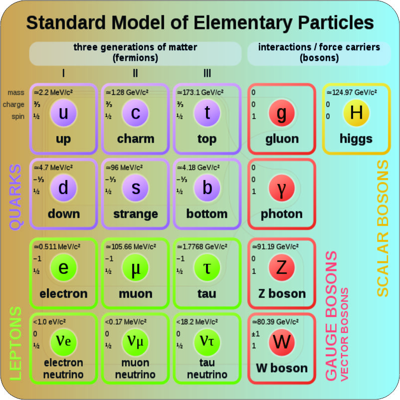 “Mm-hm. Chemists would say that ‘subatomic‘ is about electrons, protons and neutrons. Count an atom’s electrons. That and some fairly simple rules can tell you what structure types it prefers to participate in and what it reacts with. Count the protons and neutrons in its nucleus. That gives you its atomic weight and starts you on the road to figuring reaction quantities. That’s all that the chemists need to know about atoms. All due respect, Susan, but physicists want to dig deeper. That’s what the Standard Model is all about.”