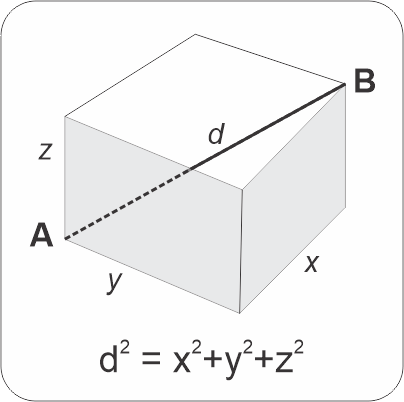 “Right, so much for flat pictures. Let’s up our game by a dimension. Here’s that same A–B line but it’s in a 3D box. <Maybe‑an‑Art‑Major snorts at Jim’s amateur attempt at perspective.> Fortunately, the Pythagoras formula extends quite nicely to three dimensions. It was fun figuring out why.”