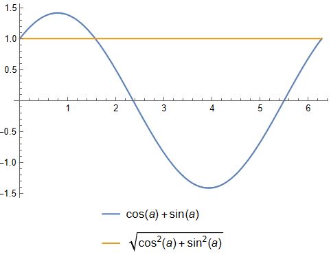 “But for every circular function and formula there’s a hyperbolic partner. Now watch what happens when we combine a sine and cosine. I’ll do it two ways, a simple sum and the Pythagorean sum.”