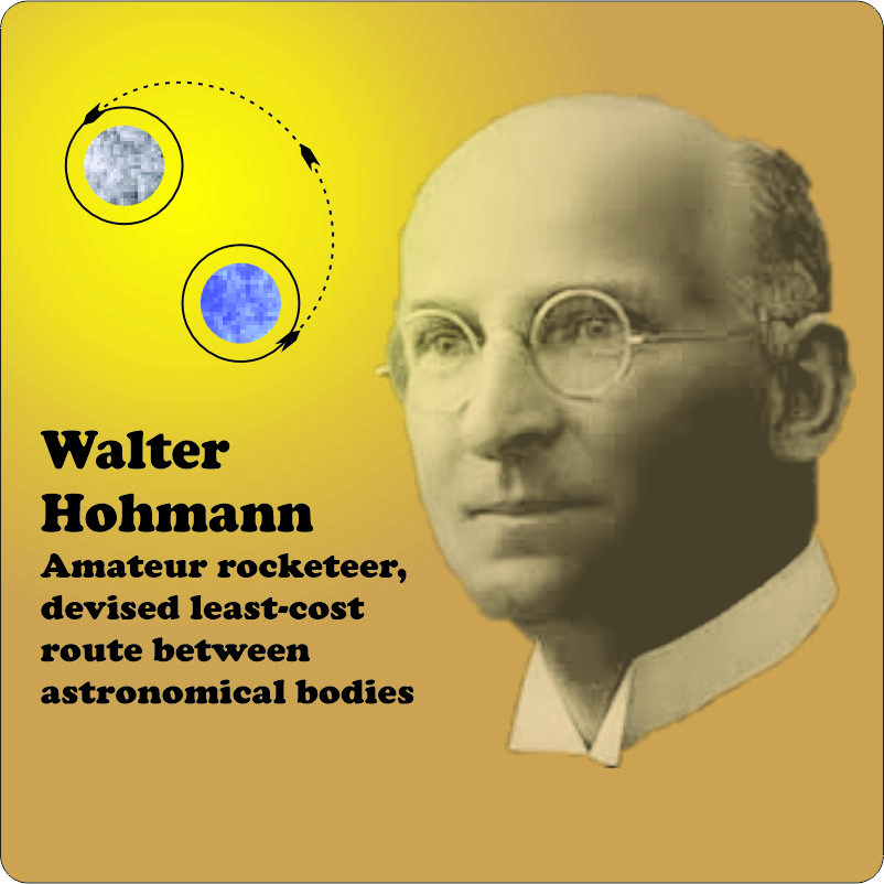 “German engineer. When he was a kid he read sci‑fi like the rest of us and that got him into the amateur rocketry scene. Got to be a leader in the German amateur rocket club, published a couple of leading‑edge rocket science books in the 1920s but dropped out of the field when the Nazis started rolling and he figured they’d build rocket weapons. Anyhow, he invented this orbit that starts off tangent to a circle around one planet or something, follows an ellipse to end tangent to a circle around something else. Smooth transitions at both ends, cheapest way you can get from here to there. Kinks in the routing cost you fuel and cargo capacity to turn. Guy shoulda patented it.”