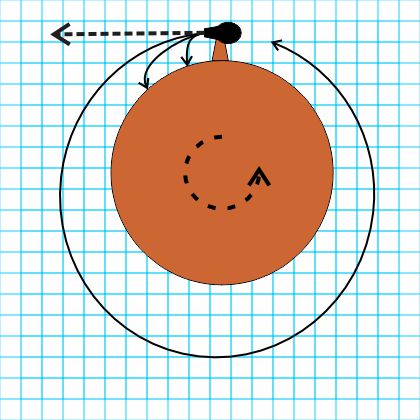 “Yeah, well, suppose that cannon’s at the Equator <adding dotted lines to Sy’s diagram> and aimed with the Earth’s spin and suppose we load in enough powder for the ball to go straight horizontal, which is what it’d do with just centrifugal force.”