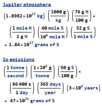 “Mm-hm. Now, using your tonne per second loss rate and guessing it’s 50% sulfur and that’s been going on for ¾ of the system’s life so far, I get that Io may have shed about 5×1022 grams of sulfur. That’s short by 4½ powers of 10. Sorry, Al, Io contributed a little to Jupiter’s sulfur stash but not enough to promote your idea to a conjecture.”