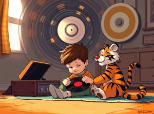 “Came from a Calvin And Hobbes comic strip some years ago but I saw it again on the internet. Calvin, that’s the kid who has a stuffed tiger named Hobbes but it talks, he’s sitting on the floor listening to something on his record player which tells you how old the strip is. His Dad comes over, points one finger at the disk’s edge and another at the label near the center. Got the picture?”