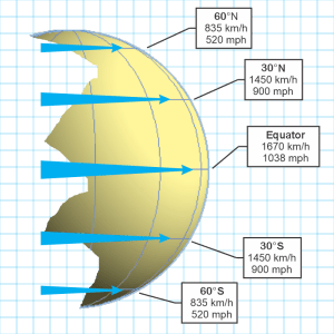 “Not really orbits, more like equilibrium bands. The concept comes from the theoretical notion that every latitude along a meridian has a natural equilibrium speed where air pressure balances other forces. The bands would be parallel circles around the globe except for geography and transient disturbances. Dallas’ 1450‑km/h number was an example. If you exceed your local natural speed, centrifugal force moves you towards the Equator; if you’re a slowpoke, you’re shoved towards the nearest pole. Real weather’s more complicated.”