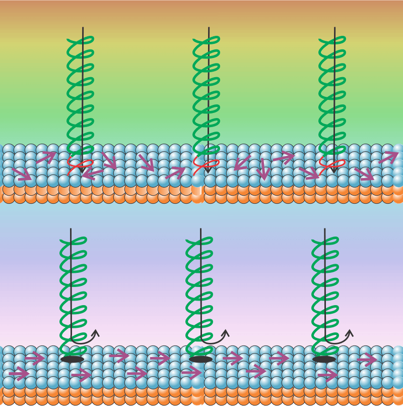 “The top half is the ordinary situation, like in a copper wire. Most of the current is carried by electrons near the surface, but there’s a lot of random motion there, electrons bouncing off of impurities and crystal defects and boundaries. That’s where ordinary conduction’s resistance comes from. Compare that with the diagram’s bottom half, a seriously simplified view of superconduction. Here the electrons act like soldiers on parade, all quantum‑entangled with each other and moving as one big unit.”