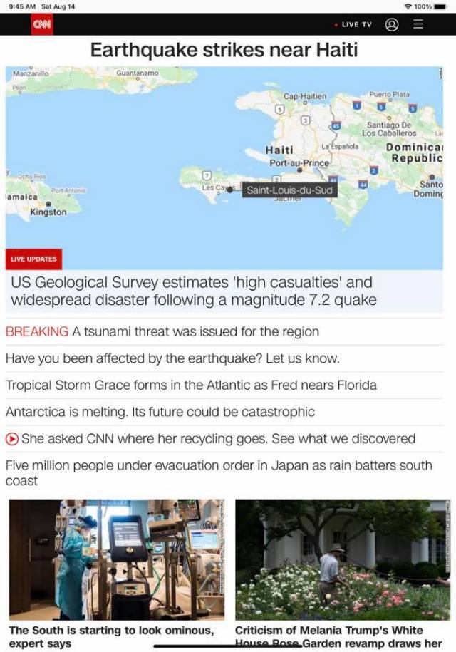 This is a series of screen shots, collected by Cheryl Hays, that displays what each news source considers to be the top news of today, 14 August 2021. You be the judge of which are paying attention to the important stuff.