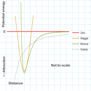 “Pretty much, but at this level we don’t have to bother with gravity at all. It’s about a factor of 1038 weaker than electric interactions. Molecular motions are dominated by electromagnetic fields. Some are from a molecule’s other internal components, some from whatever’s around that brandishes a charge. We’ve got two basic patterns. One of them, I’m labeling it ‘Waggle,’ works like a pendulum, sweeping up and down that U‑shape around some minimum position, high kinetic energy where the potential energy’s lowest and vice‑versa. You know how water’s H‑O‑H molecules have that the V‑shape?”