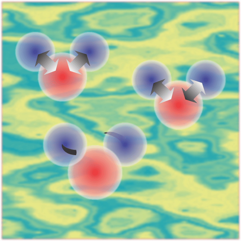 “Mm‑hm. Well, the V‑shape gives that molecule three different ways to waggle. One’s like breathing, both sides out then both sides in. If the hydrogens move too far from the oxygen, that stretches their chemical bonds and increases their potential energy so they turn around and go back. If they get too close, same thing. Bond strength is about the depth of the U. The poor hydrogens just stretch in and out eternally, swinging up and down that symmetric curve.”