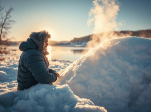 “No, no, something much more interesting. You’re looking at something that I’ve seen only a couple of times so you’re a lucky man. That’s steam, or it would be steam at a slightly higher temperature. What you’re looking at is distilled snow. See the sparkles from ice crystals in that cloud? Beautiful. Takes a very special set of circumstances to make that happen.”