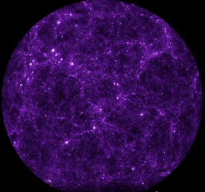 “Remember how big space is. These filaments span the widths of multiple galaxies. Do the math. A thread could be on the order of 100 million lightyears long by 1000 lightyears in diameter. A lightyear is 1016 meters. The thread has a volume of about 1062 cubic meters. At 10-26 kilogram per cubic meter that’s 1036 kilograms which is comparable to the mass of a small galaxy. That’s just one thread. Add them up and you get roughly half the baryons in the Universe, all hiding in the Web.”